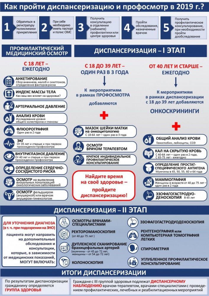 Для начала необходимо обратиться в поликлинику, наличие полиса ОМС обязательно. Диспансеризация проводится в два этапа. На первом этапе для всех пациентов предусмотрено анкетирование, анализы, осмотры у врачей. Их количество зависит от пола и возраста. По результатам первого этапа пациентов, которым нужно уточнить диагноз и назначить лечение, отправят на обследования к профильным специалистам.